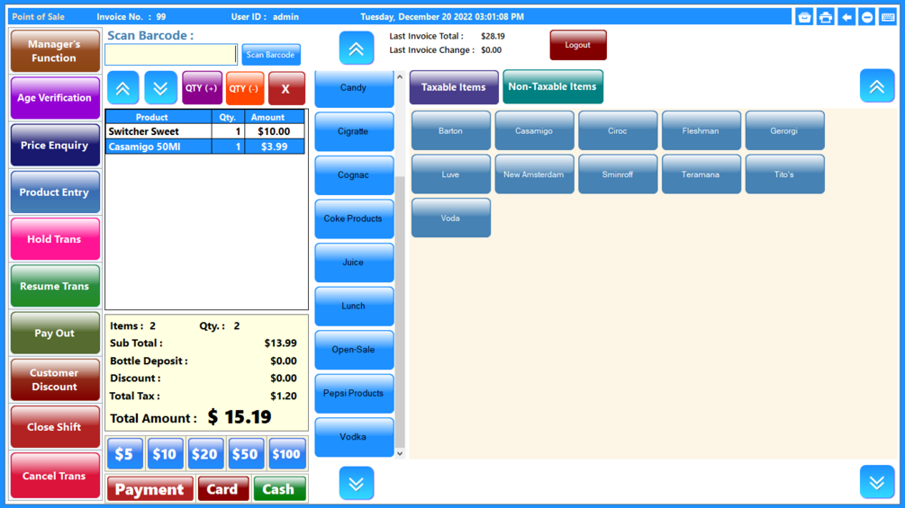 sales register ,age verification , hold & resume transaction , managers fuction quick product add